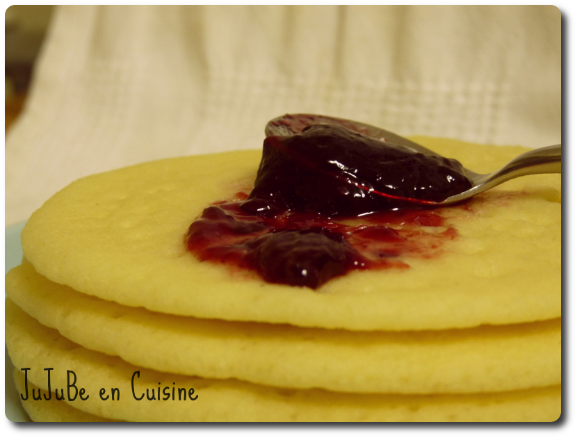 Sarah précise dans sa recette que les baghrir se dégustent avec du beurre fondu et du miel. A la maison nous avons préféré la confiture de cerises noires. Rien à voir, je sais bien…