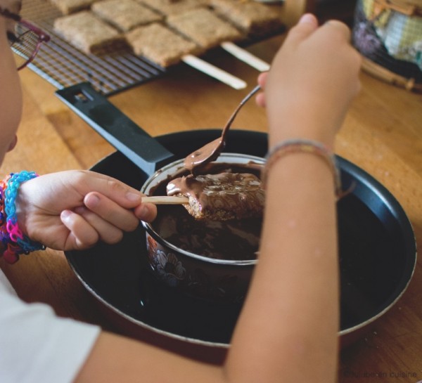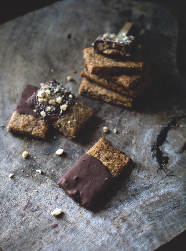Vous remarquerez cependant que les miens sont un tout petit peu plus « cochons » (spécial dédicace à ma Lili qui utilise cette expression pour dire « gourmand » :)), je n’ai pas pu m’empêcher d’en recouvrir certain de chocolat… Mais c’est pas ma faaaaaute on est trop gourmands chez nous… Mais c’était du chocolat pâtissier bio de chez Bonneterre, donc je suis pardonnée, non ? :-P