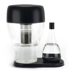 Elle a également une contenance plus faible, mais propose une carafe prête à l’emploi pour le service (mais je pense que cela ne pourrait pas « fonctionner » chez nous, on serait bien du genre à oublier de replacer la carafe sur le support, déjà qu’il nous arrive d’oublier de re-remplir la fontaine…)
