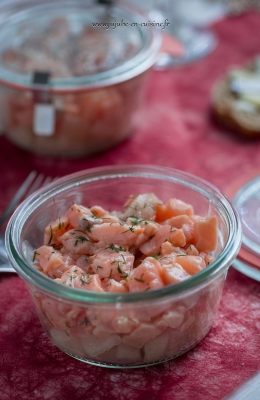 Voilà une idée d'entrée festive (ou pas d'ailleurs) qui peut parfaitement être servi dans de moindres proportions en apéritif présenté en verrines par exemple (ça se fait toujours les...