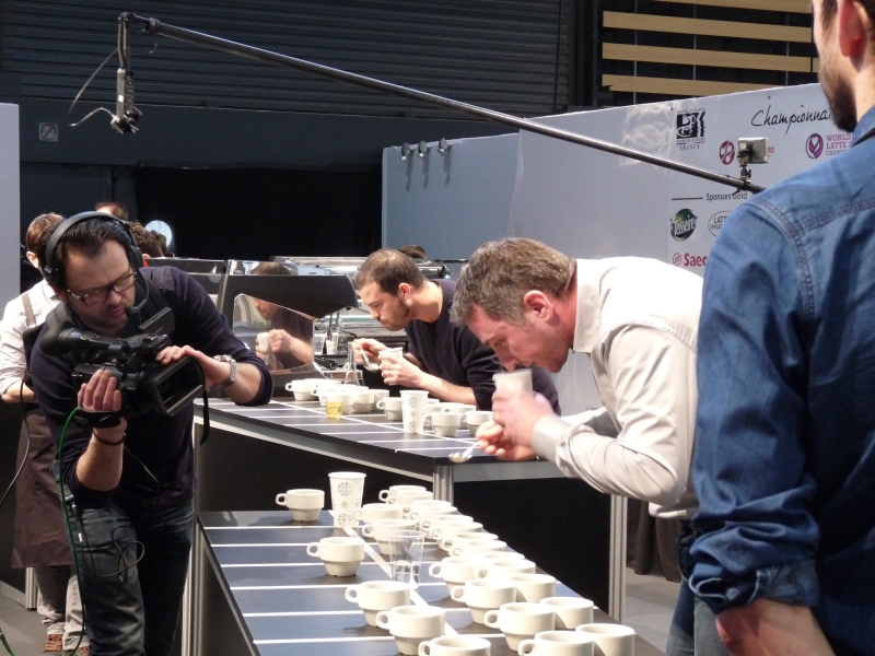 Les concurrents prennent une cuillère de café dans une tasse, la goute, la crache et passe à la tasse suivant. Sur le moment j’ai bien compris qu’il s’agissait de trouver quelque chose, mais je n’aurais pas pensé que ça se faisait sur du café (j’en été resté au classique « blind test » sur le vin… Qu’est ce que je peux être has been parfois !)