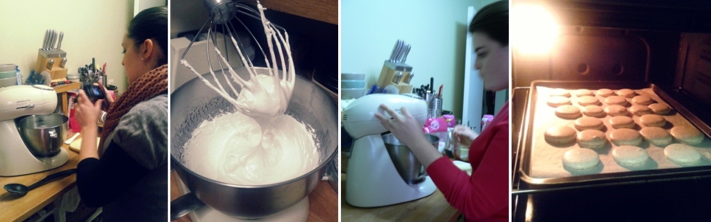 Je profite de cet atelier pour tester une recette de macarons que j’ai toujours voulu tenter : réaliser les coques avec du sucre cuit (meringue italienne). Pendant que les blancs se montent en neige, on prépare un sucre boulé que l’on verse par dessus. Autant vous dire que je ne possède pas 3 bras, avec mon petit batteur électrique à main je ne serais pas allé bien loin… (A moins de me faire assister, mais le chéri n’est pas trop branché pâtisserie et ma fille n’est pas encore assez grande, mais plus tard je m’en ferai une alliée de taille ! ;))