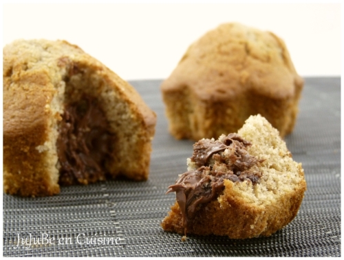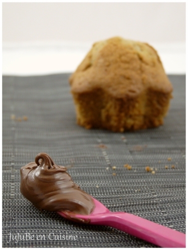 Remplissez les moules au 1/2, déposez une boule de Nutella, puis versez de nouveau de la pâte par dessus de manière à remplir les moules au 2/3 maximum (ils vont beaucoup gonfler, il ne faudrait pas qu’ils débordent).