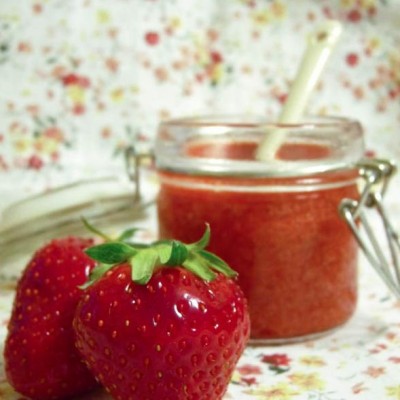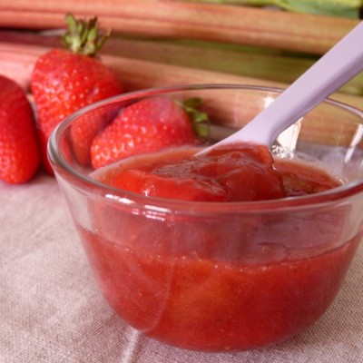 Pour le coulis, j’ai repris la technique de Jamie Oliver utilisée pour les iles flottantes à la rhubarbe, mais encore une fois, j’ai une alternative. Si vous avez de la confiture fraise-rhubarbe, il vous suffit d’en prélever le sirop (ou carrément une cuillère de confiture pour chaque verrine, si les morceaux de vous gênent pas).