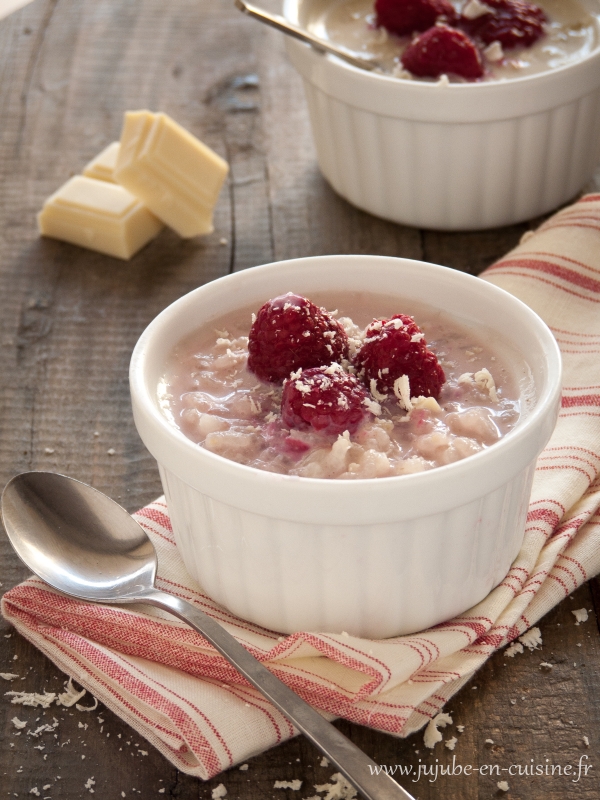 Depuis quelques temps j’avais envie de faire quelque chose avec du chocolat blanc et des framboises (surgelées… Oui je sais… Mais je n’en peux plus de ce froid, de ce vent ! J’invoque comme je le peux les saisons chaudes !) j’ai donc pensé au riz au lait, parce que ça fait longtemps que je n’en ai pas fait !