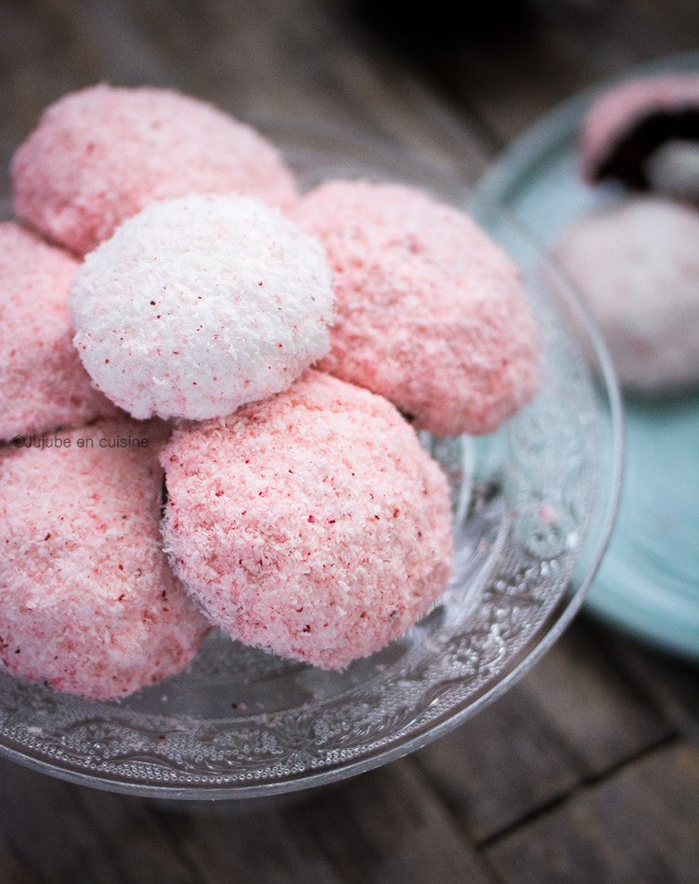 Il existe plusieurs couleurs de sno balls, mais la version la plus représentée sur les blogs américains est celle où la noix de coco râpée est teintée en rose. J’aime bien le rose, alors j’ai suivi le mouvement ;-) Même si certaines de mes sno balls se sont retrouvéee blanches suite à une rupture de stock de coco colorée, mais c’est joli aussi non ? Et pour le coup ils portent mieux leur nom ! (snow balls : boules de neige)