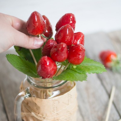 Normalement, pour l’enrobage des pommes d’amour on utilise du sirop de glucose (ou du miel), pour le rendre plus « tendre » (moins dur, quoi). Je ne l’ai pas fait car ici le caramel est en fine couche, pas de risque de vous casser une dent en mangeant vos fraises.