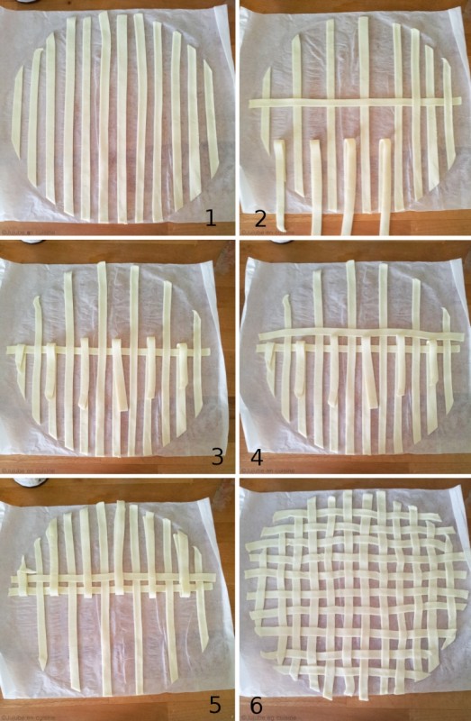 Une fois qu’elles sont toutes dépliez, vous constatez que la bandelettes du fond de tarte secondaire est entrelacé (dessus/dessous/dessus/dessous/etc…) avec les bandes de pâte du fond de tarte principal.