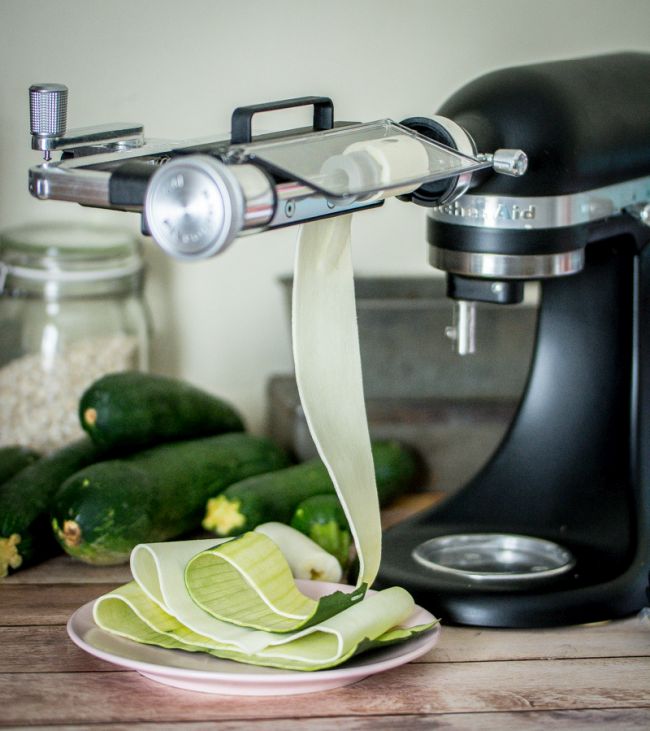 Vous pouvez réaliser les lamelles de courgettes avec un économe, ou comme moi : l’accessoire coupe lanières de fruits et légumes de KitchenAid !