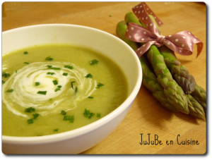 Hier je vous présentais des œufs brouillés aux pointes d’asperges et ciboulette pour lesquels je vous disais de couper les asperges de manière à ne garder que les pointes, mais de réservez les queues… Pour faire un velouté !
